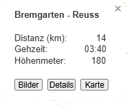 Im Kopf des Popup-Fensters wird die laufende Nummer und der Tourenname, sowie das Datum, an dem die Tour stattgefunden hat, angezeigt. Das Bild der Tour kann durch Anklicken des Zoom-Symbols